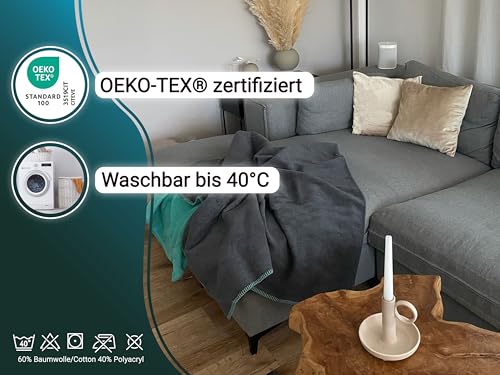 HOCHWERTIGES MATERIAL – Produziert wurde die flauschige Wohndecke alle 60% Baumwolle und 40% Polyacryl mit einem Materialgewicht von 420 g/qm. Diese Zusammensetzung macht sie besonders langlebig und angenehm weich auf Ihrer Haut.
